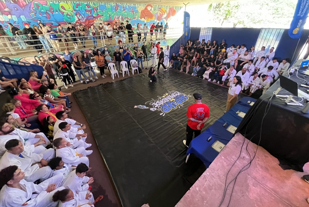 A Ação Hip-Hop Comunidade também contou com a participação de projetos e instituições sociais de diferentes regiões do Distrito Federal, fortalecendo o diálogo entre o poder público e as iniciativas comunitárias. Durante a programação, o público acompanhou apresentações de karatê realizadas pela Associação Emival, de Sobradinho, e pelo Uruma Kan, de Samambaia, que levaram ao evento demonstrações de disciplina, técnica e integração social por meio do esporte.