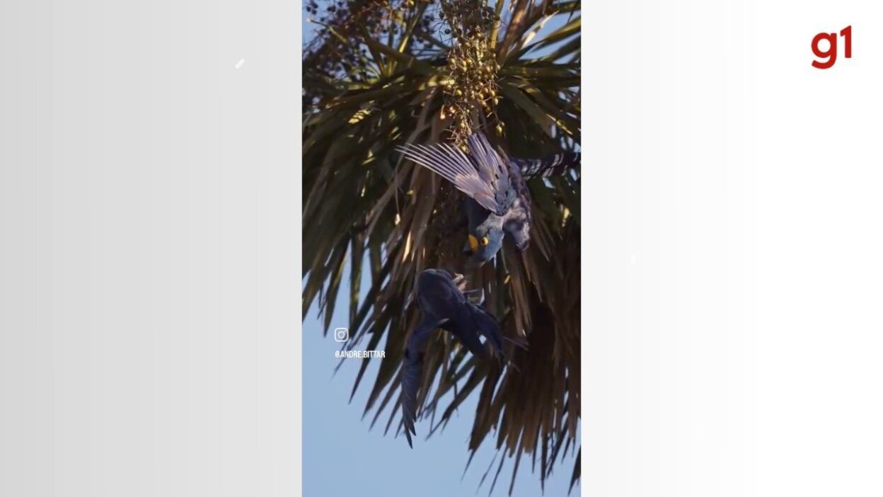 Registro foi feito pelo fotojornalista André Bittar, que compartilhou as imagens nas redes sociais. Vídeo tem mais de 15 mil visualizações. Profissional contou ao g1 como capturou o momento e falou sobre trajetória na fotografia de natureza. Araras-azuis são flagradas ‘disputando’ comida no Pantanal de MS