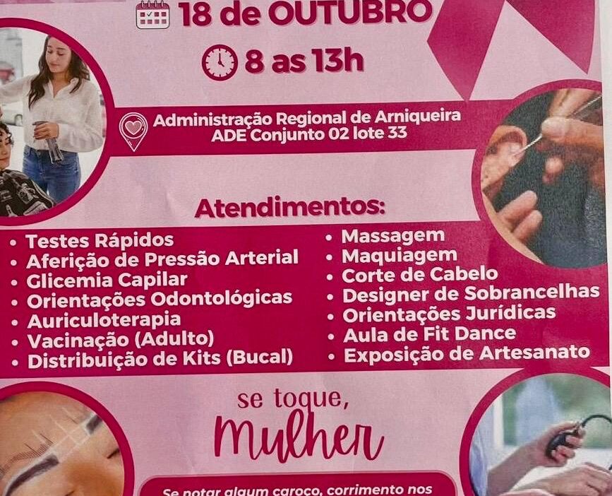 Telma lembra ainda que a Administração de Arniqueira realiza, anualmente, atividades semelhantes no mês seguinte, durante o Novembro Azul, voltadas à saúde do homem. “Assim como o Outubro Rosa é dedicado às mulheres, o Novembro Azul busca conscientizar os homens sobre a prevenção e o diagnóstico precoce do câncer de próstata. É fundamental que todos, independentemente do gênero, se cuidem e façam exames regulares”, acrescentou.