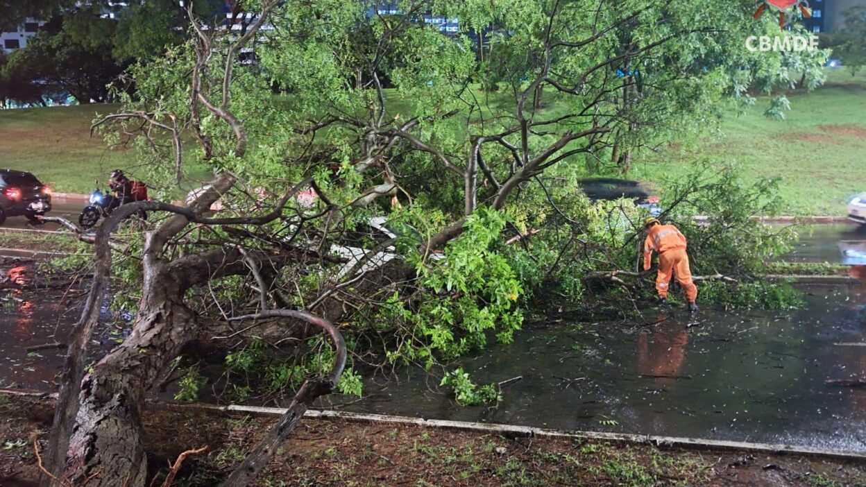 Uma forte chuva que atingiu o Plano Piloto no início da noite desta segunda-feira (1º) provocou a queda de uma árvore sobre um veículo no Setor de Autarquias Sul, região central de Brasília. O incidente ocorreu por volta das 19h40 e levou o Corpo de Bombeiros Militar do Distrito Federal a mobilizar duas viaturas para a ocorrência.