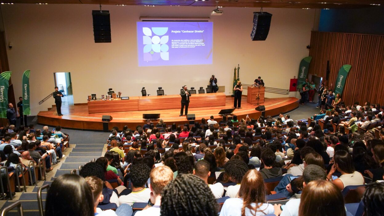 A Defensoria Pública do Distrito Federal (DPDF), por meio da Escola de Assistência Jurídica da DPDF (Easjur/DPDF), reuniu 700 estudantes de diversas regiões administrativas do DF em aulão preparatório para o Programa de Avaliação Seriada (PAS) da Universidade de Brasília (UnB) e o Exame Nacional do Ensino Médio (Enem) no auditório da Câmara Legislativa do Distrito Federal (CLDF), que atingiu a capacidade máxima. A conferência, intitulada A sustentabilidade das relações humanas a partir das políticas públicas: construindo uma cidadania ativa foi realizada nesta quinta-feira (27), em parceria com a Defensoria Pública da União (DPU) e outras instituições públicas e privadas.