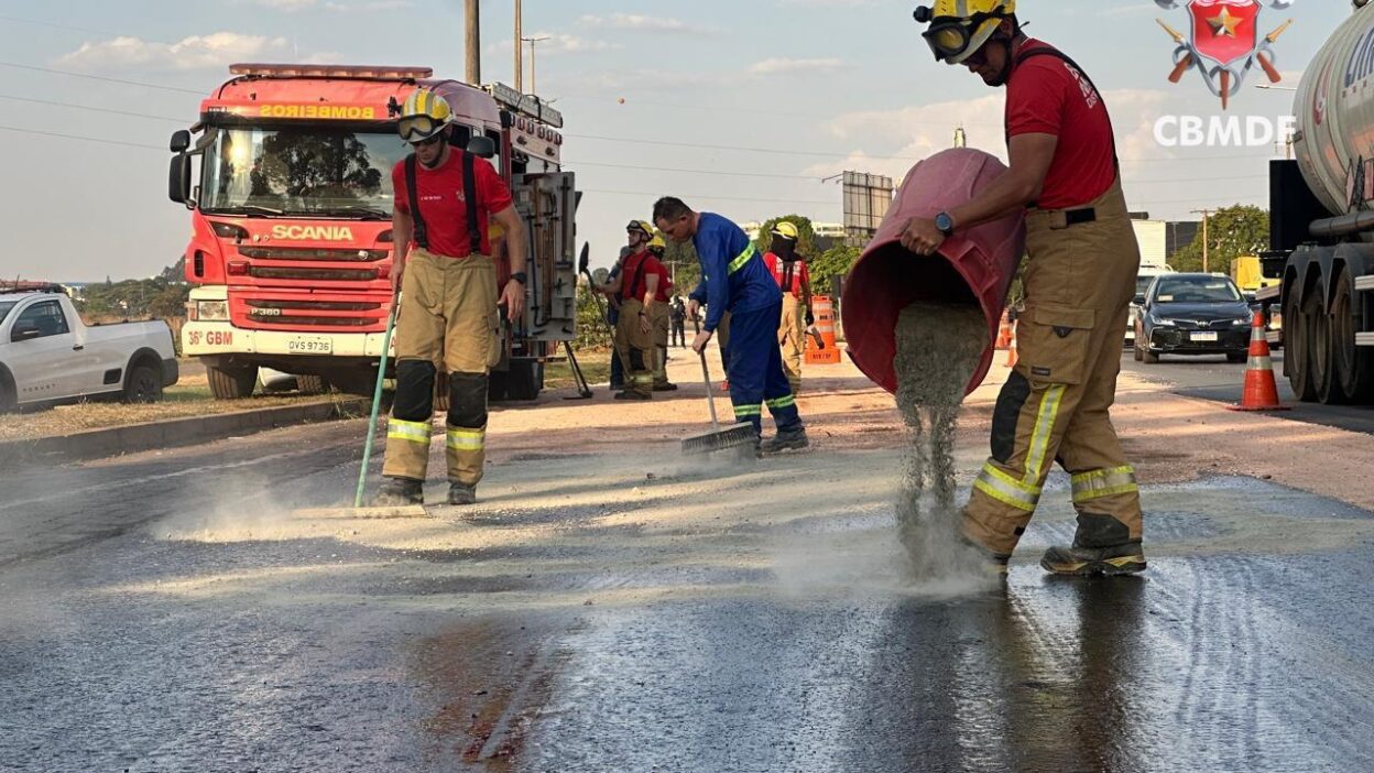Uma carreta bitrem carregada com óleo vegetal provocou um vazamento que mobilizou o Corpo de Bombeiros Militar do Distrito Federal (CBMDF) na tarde desta terça-feira (7). O incidente ocorreu na DF-251, nas proximidades da fábrica da Coca-Cola, em Taguatinga, e deixou parte da pista coberta pelo produto.