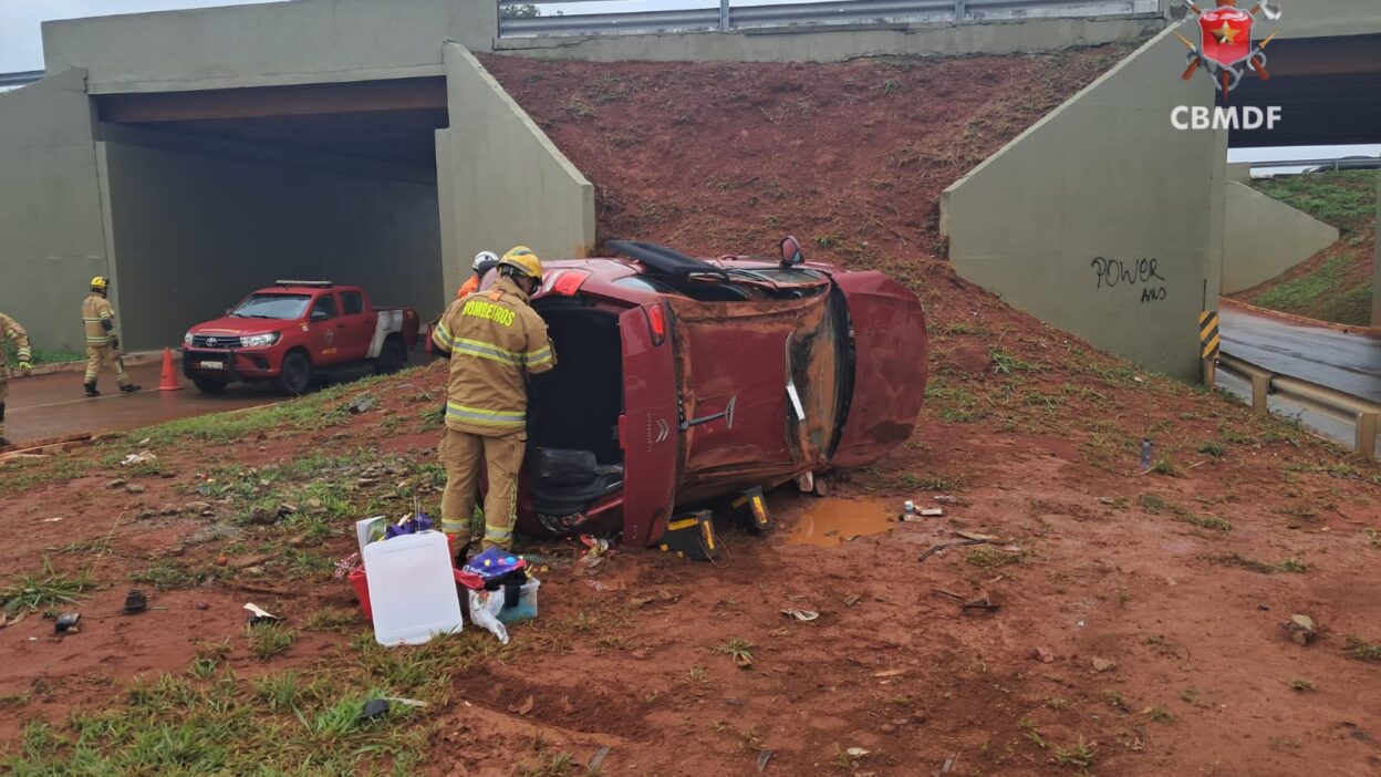 Bombeiros resgatam vítima de carro capotado no Setor de Clubes