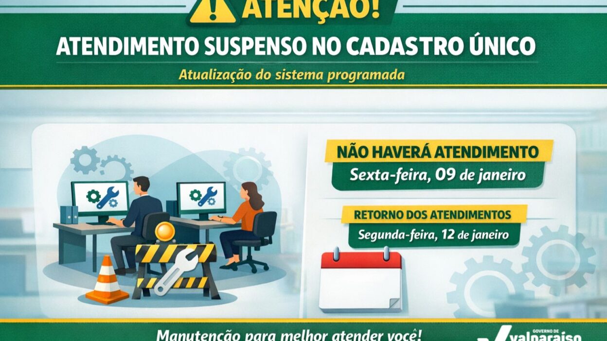 O Cadastro Único informa que, na próxima sexta-feira, dia 09 de janeiro, não haverá atendimento na unidade, em razão de uma atualização programada do sistema. A medida é necessária para garantir a melhoria contínua dos serviços prestados à população.