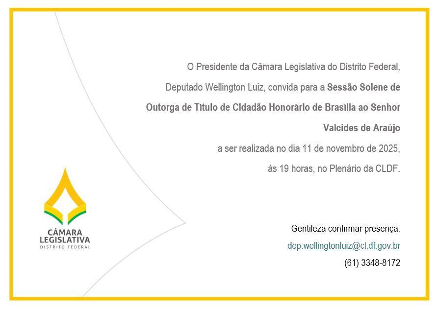 A Câmara Legislativa do Distrito Federal (CLDF) realizará, no próximo 11 de novembro, uma sessão solene para conceder o Título de Cidadão Honorário de Brasília ao diretor regional do Sesc-DF, Valcides de Araújo.