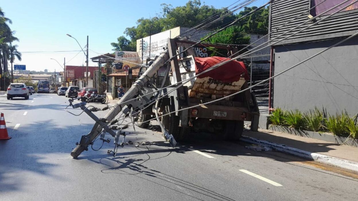 Um caminhão carregado com caçambas bateu em um poste de energia na Avenida Geraldo Athayde, no bairro Alto São João, em Montes Claros, na manhã desta segunda-feira (23). Por causa do acidente, mais de 40 residências da região ficaram sem energia elétrica.