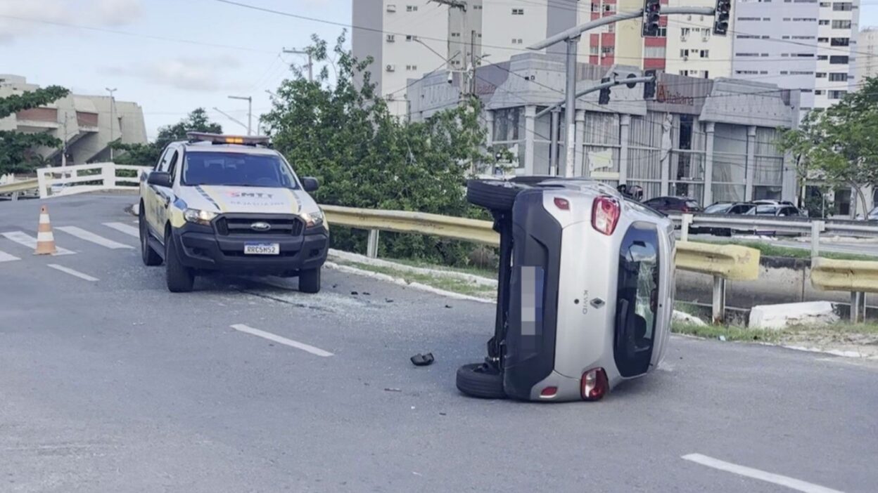 Um carro capotou na Avenida Anísio Azevedo, em Aracaju, depois de uma colisão contra um outro carro, deixando duas pessoas feridas, na tarde desta quarta-feira (4).