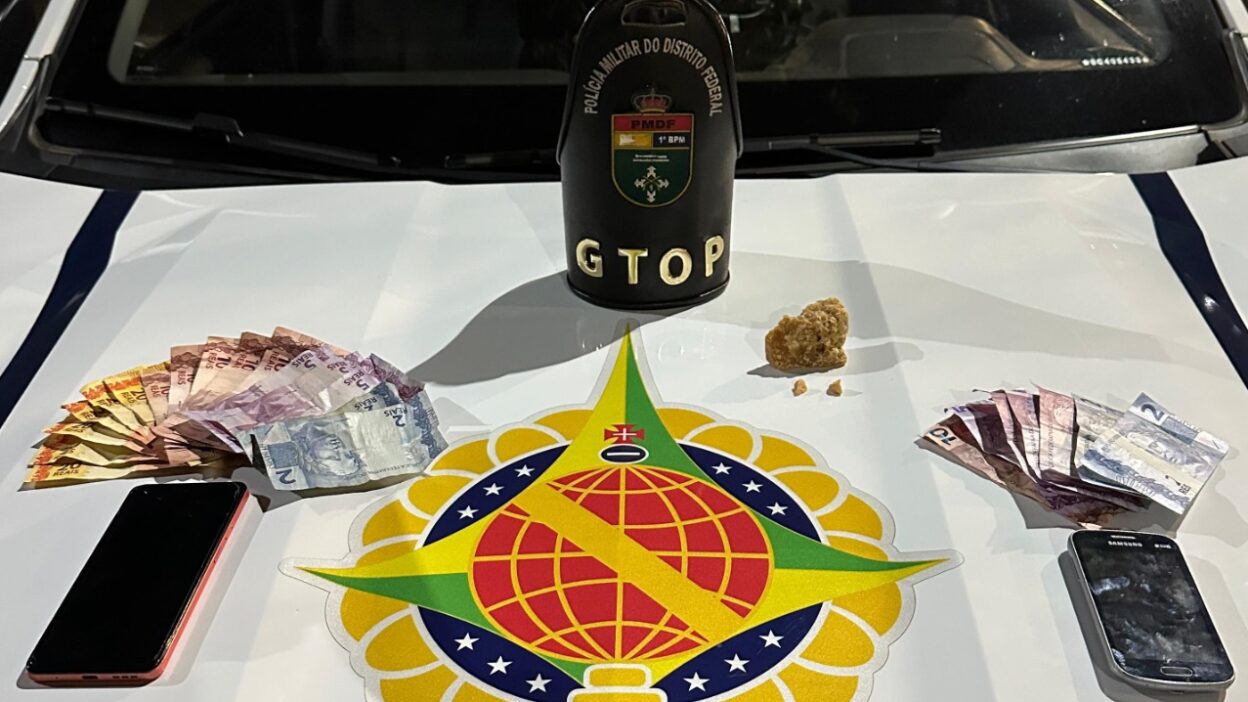 Com o casal, os militares encontraram diversas porções de crack, R$ 223 em dinheiro e dois celulares.