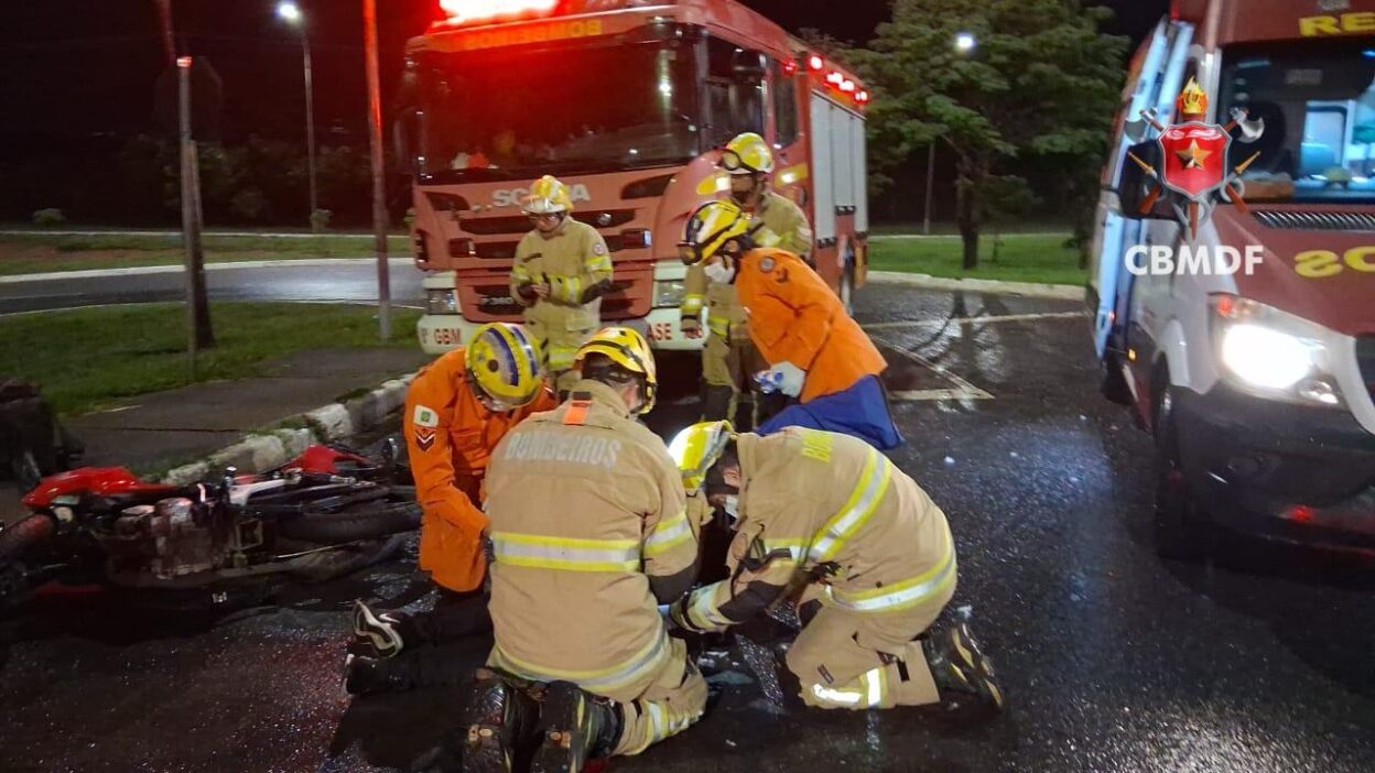 Uma colisão entre um Ford Ka prata e uma motocicleta Honda vermelha interrompeu o fluxo no viaduto de acesso à L4 Norte, em Brasília, na noite desta sexta-feira (28). O Corpo de Bombeiros Militar do Distrito Federal foi acionado às 22h08 e enviou duas viaturas de resgate para a ocorrência, que rapidamente chamou atenção de motoristas que passavam pelo local.