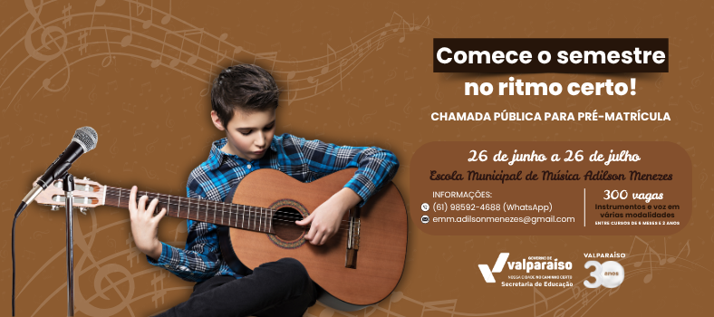 A Secretaria Municipal de Educação anuncia a abertura do Edital de Chamada Pública nº 002/2025, que disponibiliza 300 vagas gratuitas para cursos de instrumento musical e voz na Escola Municipal de Música Adilson Menezes, com início no segundo semestre de 2025.