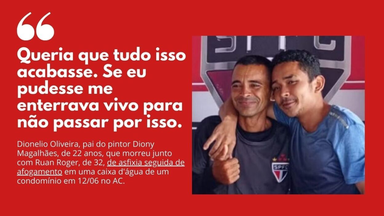 As palavras emocionadas são do autônomo Dionelio Oliveira, pai do pintor Diony Magalhães, de 22 anos, que morreu junto com Ruan Roger da Silva Barbosa, de 32 anos, de asfixia seguida de afogamento em uma caixa d’água, em Rio Branco, no dia 12 de junho no Condomínio Via Parque.