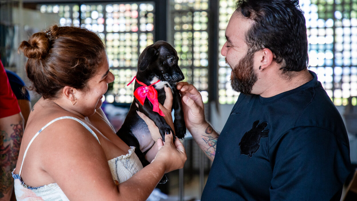 Entre olhares curiosos, latidos e abanadas de rabo, o casal Diógenes Hada, 35 anos, e Maira Menezes, 35 anos, encontrou uma nova companhia. Eles decidiram adotar a Bombom, uma cadela de dois meses, de pelagem preta, após o antigo pet fugir de casa, há dois anos. Ela foi uma das resgatadas por meio de uma decisão judicial que a retirou das condições precárias em que vivia junto a outros cães com uma acumuladora.