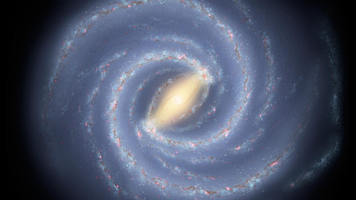 Novo estudo sugere que até 100 galáxias muito fracas giram em torno da nossa, mas ainda não conseguimos enxergá-las. Representação gráfica de nossa galáxia, a Via Láctea, que é organizada em braçios espirais formados por estrelas gigantes que iluminam os gases e poeiras interestelares.
