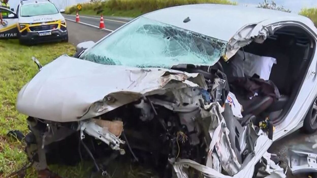 Com a força do impacto, o motor do carro foi lançado e atingiu um outro veículo. O motorista do caminhão e as pessoas que estavam no outro carro não se feriram.