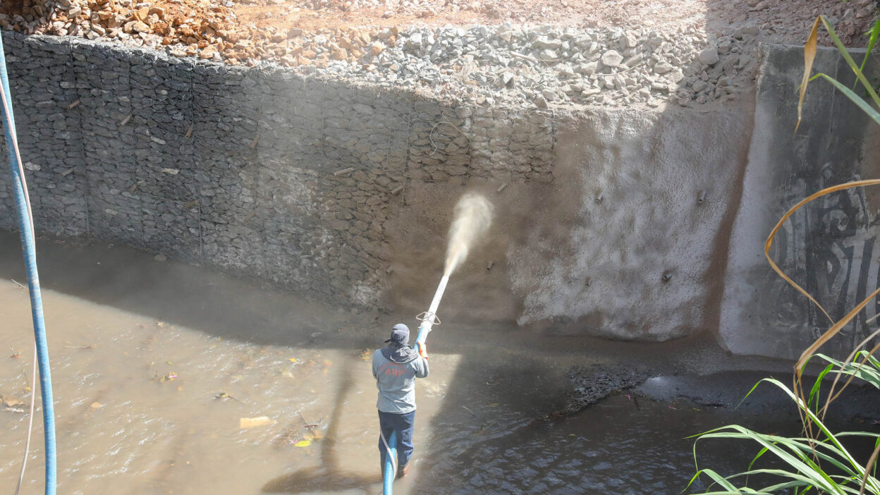 “A gente está jateando concreto na superfície externa do muro de arrimo que fica virado para o lado do córrego, justamente para dar mais proteção no próximo período chuvoso, quando o nível da água do córrego se eleva. E isso, consequentemente, vai proteger o aterro de um possível desmoronamento no futuro”, explicou Jarbas da Silva, engenheiro do DER-DF.