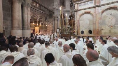 Mundo1 Min Leitura Redaçãoem23/04/2025 Missa para papa Francisco é celebrada no Santo Sepulcro de Jerusalém O Patriarca Latino de Jerusalém, Arcebispo Pierbattista Pizzaballa, celebrou uma missa em homenagem ao papa Francisco no Santo Sepulcro de…