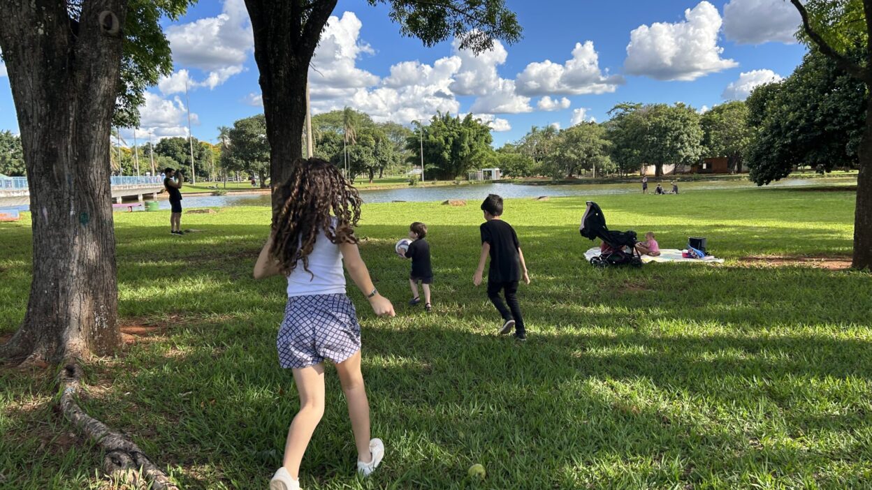 Ao lado do marido e dos três filhos, Cybelle escolheu o Parque da Cidade como destino para “arejar a cabeça”. Entre caminhadas e brincadeiras, o objetivo principal era o entretenimento dos filhos Isaac, Murilo e Bernardo, de 9, 5 e 4 anos. “Viemos para eles correrem e descontraírem. É um momento descontraído que faz toda a diferença”, pontuou.