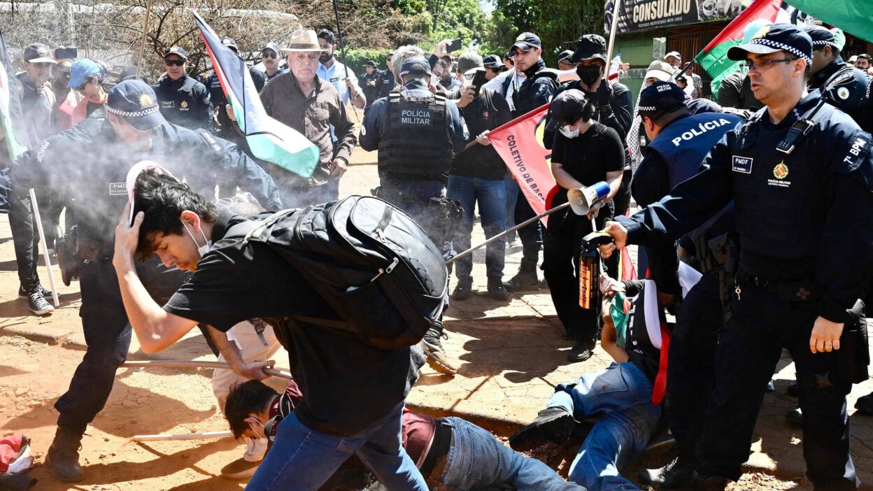 Policiais militares lançaram gás e entraram em confronto com manifestantes que realizaram um protesto pró-Palestina em frente ao prédio da Embaixada dos Estados Unidos, em Brasília, na manhã desta terça-feira (7). O dia marca os dois anos dos ataques terroristas do Hamas contra Israel e do início da guerra em Gaza.