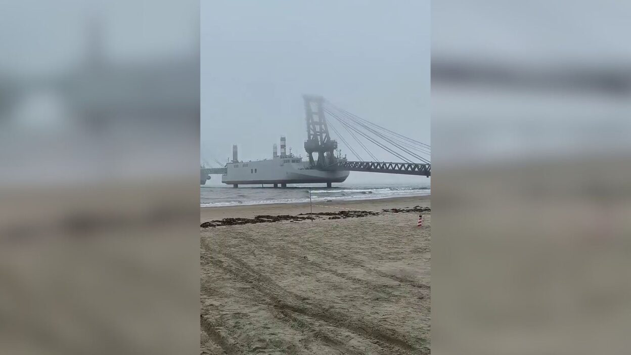 As imagens também capturaram uma balsa roll-on/roll-off (RO-RO) atracada ao lado da terceira e maior barcaça, posicionada mais distante da costa.