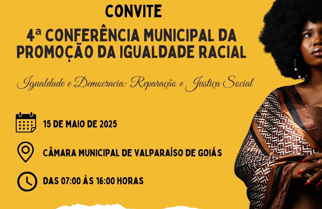 A Prefeitura de Valparaíso de Goiás, por meio da Secretaria Municipal de Assistência Social, convida toda a comunidade para a 4ª Conferência Municipal da Promoção da Igualdade Racial, que terá como tema “Igualdade e Democracia: Reparação e Justiça Social”.