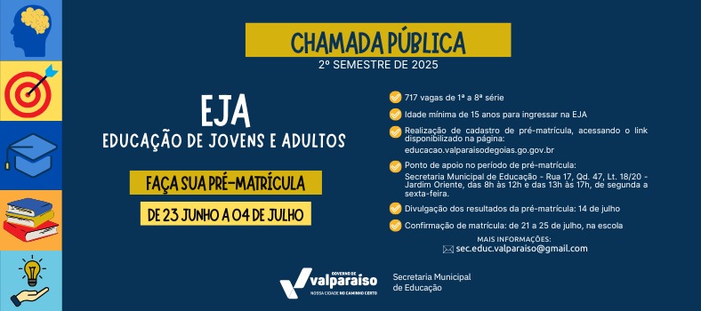 A Prefeitura de Valparaíso de Goiás, por meio da Secretaria Municipal de Educação, publicou o Edital nº 003/2025, que regulamenta o processo de pré-matrícula e matrícula da Educação de Jovens e Adultos (EJA) para o segundo semestre letivo de 2025.