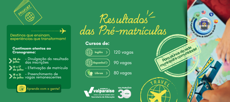 Conforme o cronograma estabelecido no Edital nº 004/2025, a Prefeitura de Valparaíso de Goiás, por meio da Secretaria Municipal de Educação, informa que foi divulgado o resultado do processo de inscrição para os cursos de línguas da Escola Municipal de Línguas de Valparaíso de Goiás.