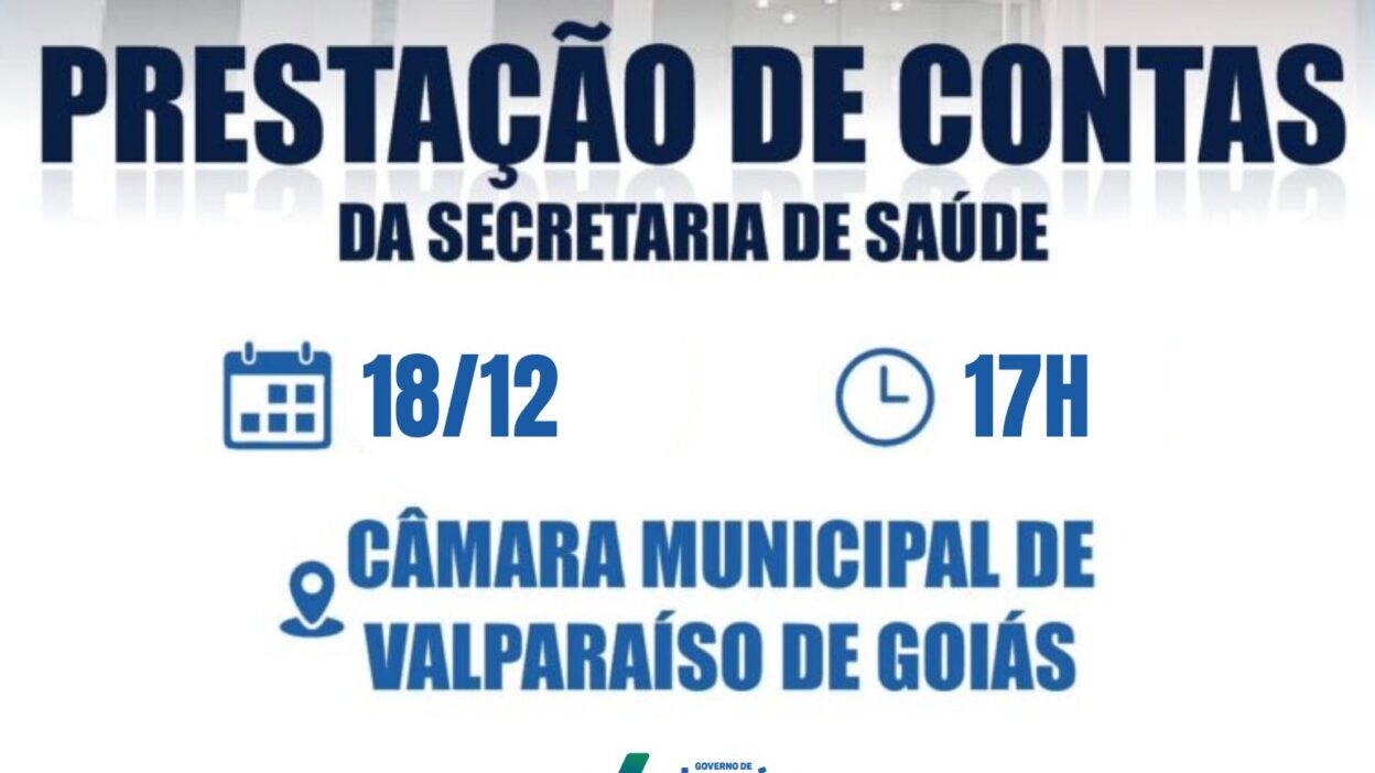 A prestação de contas da Secretaria Municipal de Saúde será realizada nesta quinta-feira (18), às 17h, no auditório da Câmara Municipal de Valparaíso de Goiás.