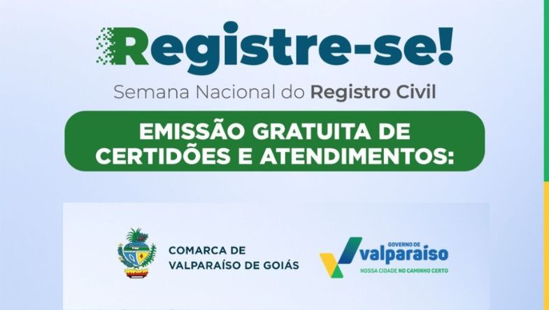 No dia 14 de maio (quarta-feira), das 9h às 17h, Valparaíso de Goiás recebe a Semana Nacional do Registro Civil – “Registre-se!”, uma iniciativa que promove a cidadania e facilita o acesso da população a serviços essenciais, totalmente gratuitos.