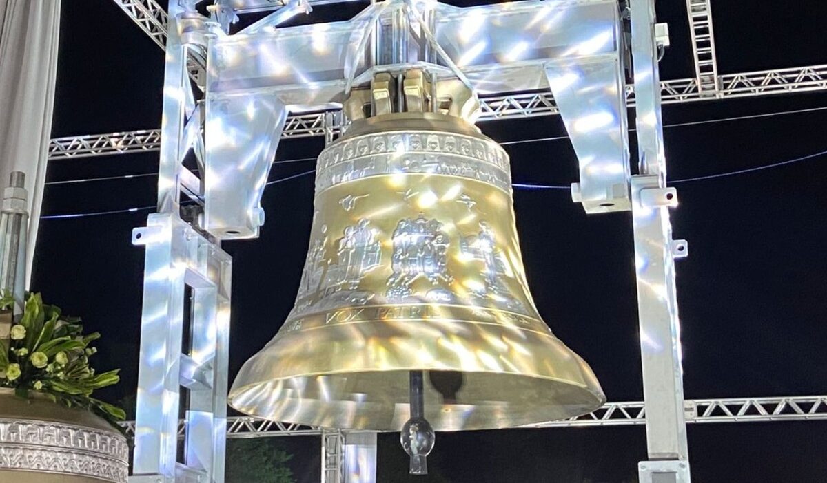 G1 transmite ao vivo a cerimônia, quando também ocorre o batismo do maior sino que badala do mundo. Sino gigante Vox Patris badala pela 1ª vez em Trindade G1 transmite ao vivo a cerimônia, quando também ocorre o batismo do maior sino que badala do mundo. Maior sino que badala do mundo toca pela 1ª vez em cerimônia que anuncia o início da Festa do Divino Pai Eterno.. Missa abençoa o Vox Patris e os dois sinos menores, São João e São Lucas. . Gigante, o Vox Patris pesa 55 toneladas e tem mais de 4 metros de altura.