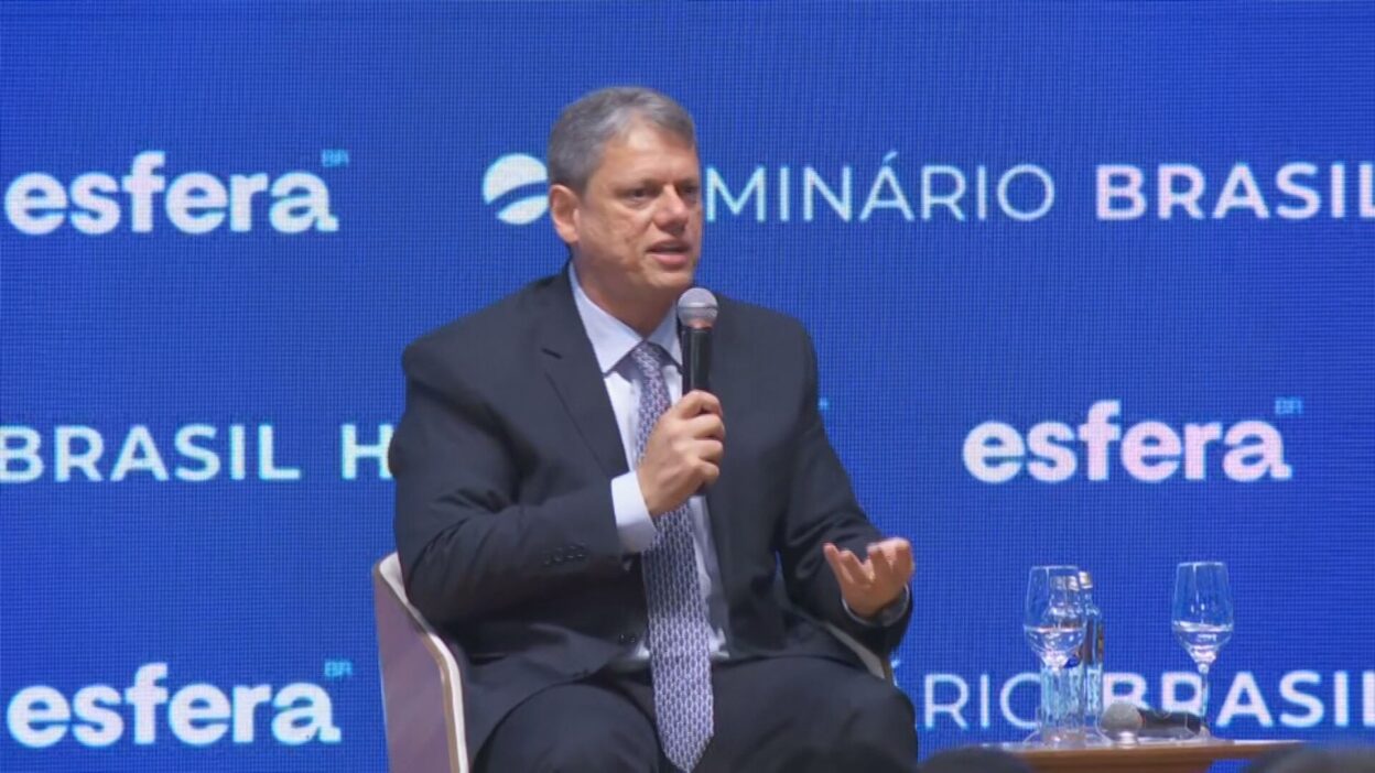 O governador Tarcísio de Freitas (Republicanos) durante o seminário da Esfera Brasil nesta segunda-feira (25), em São Paulo.