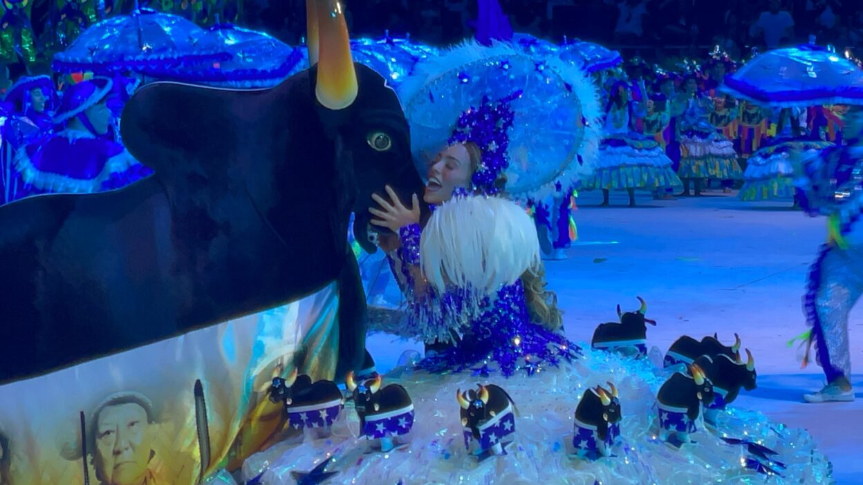 Em um dos momentos mais emocionantes da apresentação, ela dançou ao lado do boi no centro do Bumbódromo, arrancando aplausos da galera azul e branca.