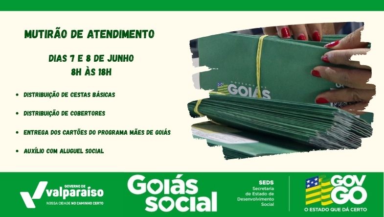 O município de Valparaíso de Goiás terá a honra de receber, nos dias 7 e 8 de junho, um dos maiores projetos de inclusão social e cidadania do Estado: o Goiás Social. A ação será realizada em frente ao terminal do bairro Céu Azul, das 8h às 18h, e deve atender mais de 10 mil pessoas ao longo do fim de semana.