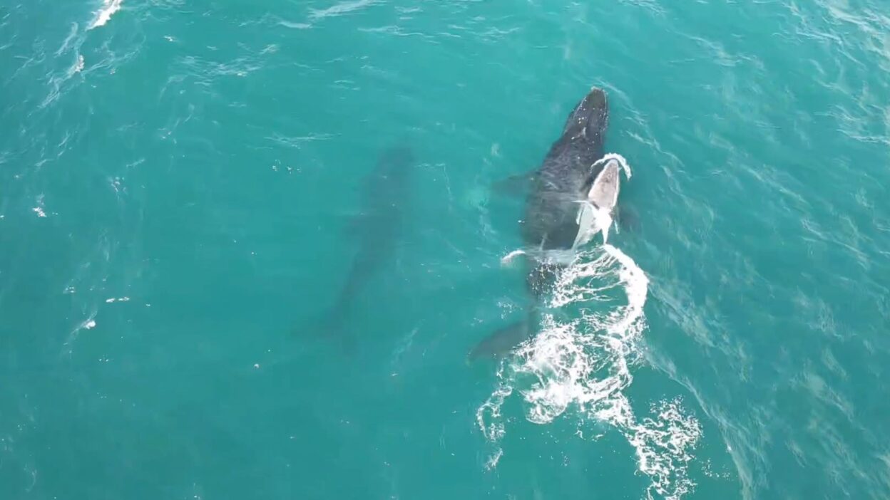 Uma baleia-jubarte foi avistada nesta segunda-feira (1º) nadando com um filhote recém-nascido na Serra, Grande Vitória. O animal fêmea estava com a barriga ainda inchada e ensinava o “bebê” a respirar, enquanto eram escoltados por outras baleias na praia de Jacaraípe. O filhote aparentava ter cerca de uma semana de vida.