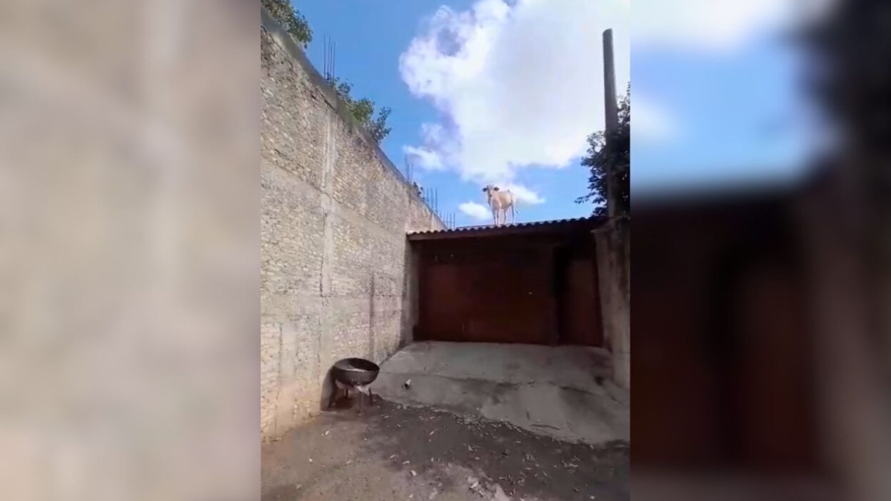 Vaca é flagrada em cima do telhado de casa em Fernandópolis (SP)